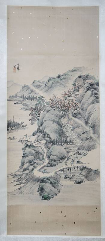 Sha Qin signiert, bergige Flusslandschaft mit Pavillons und Figurenstaffage, vierteilige Tusche und Farbe auf Papier, mit Beischriften, Signatur und Datierung 1932, Bildmaße je 79 x 33 cm, einzeln montiert auf Bildrollen