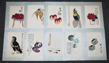 Luxusausgabe mit 23 Drucken nach bekannten Werken des Meisters Qi Baishi, alle in Seidenpassepartouts, lediglich ein Blatt mit randseitigen Stockflecken, alle anderen in sehr guter Erhaltung, je 28,5 x 18 cm, Gesamtmaß 38 x 26,5 cm, ohne Mappe und Verlagsangabe