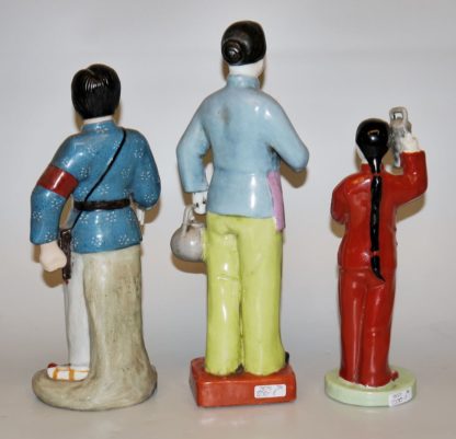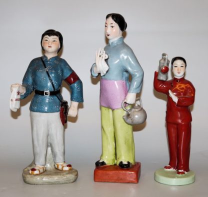 Die Tochter des Gleisarbeiters Li Yuhe mit der Signallaterne (H 23 cm) und als Volksarmistin (H 27 cm) sowie die Teehauswirtin Aqing (H 30 cm), drei originale Porzellanfiguren, Erinnerungsstücke um 1965/70