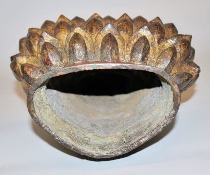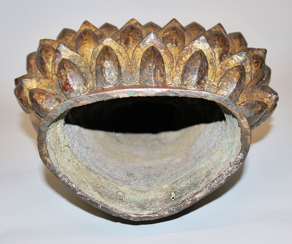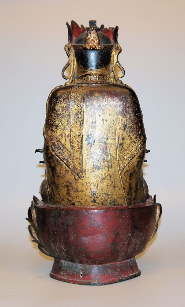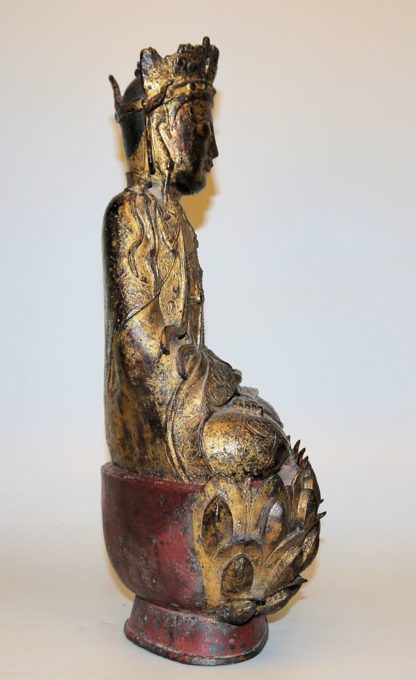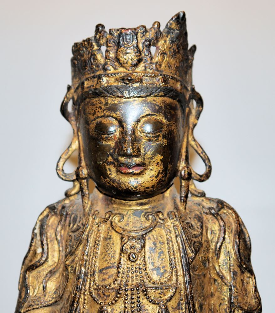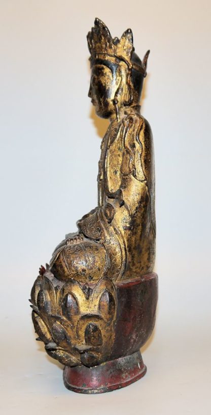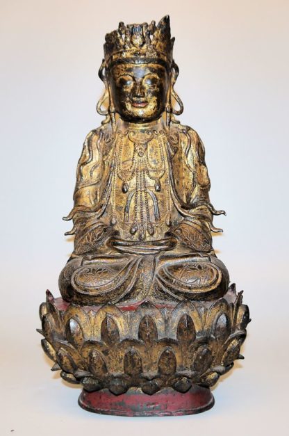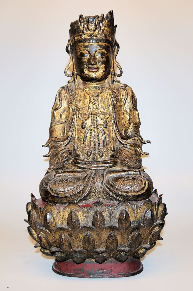 Große Bronzeplastik der Guanyin, späte Ming-Zeit, China 16./17. Jh. Die auf Lotusthron sitzende "Gottheit der Barmherzigkeit" in meditativer Haltung, Bronze mit Resten der Vergoldung und roter Lackfassung, zwei Kronenspitzen alt gechipt, das Bildnis des Buddha darin noch kenntlich, H 38 cm