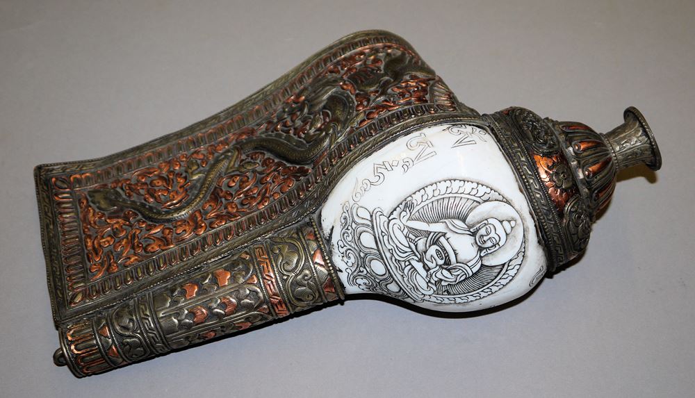 Große Dung Kar (Sanskrit: shankha) aus Meereschnecke mit gravierter Buddha-Figur und Mantras, als Signalinstrument bei buddhistischen Ritualen mit einer reich gezierten Fassung aus Kupfer und Neusilber, Gew. 1890 gr, L 33 cm