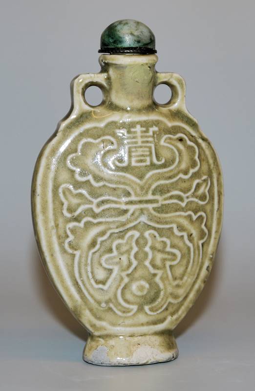 Tisch-Snuffbottle in Seladon, China 19. Jh. Flache Steinzeugflasche mit kleinen Henkeln, reliefiertes Rankenwerk und Glückszeichen unter grüner Seladonglasur, stiltypisches Exportstück für den südostasiatischen Markt, vergleiche Schiffwrack-Funde der Tek Sing, H 10,5 cm, Stopfen ergänzt