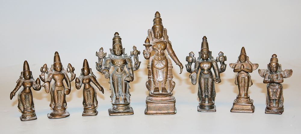 Drei kleine Bronzen des Gottes Vishnu, drei Bronzen der Göttin und zwei Bronzen des Göttervogels Garuda in menschlicher Gestalt mit Schwingen, alle mit schöner Patina aus rituellem Gebrauch, H 6,5 - 12 cm