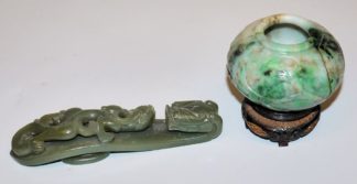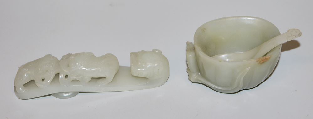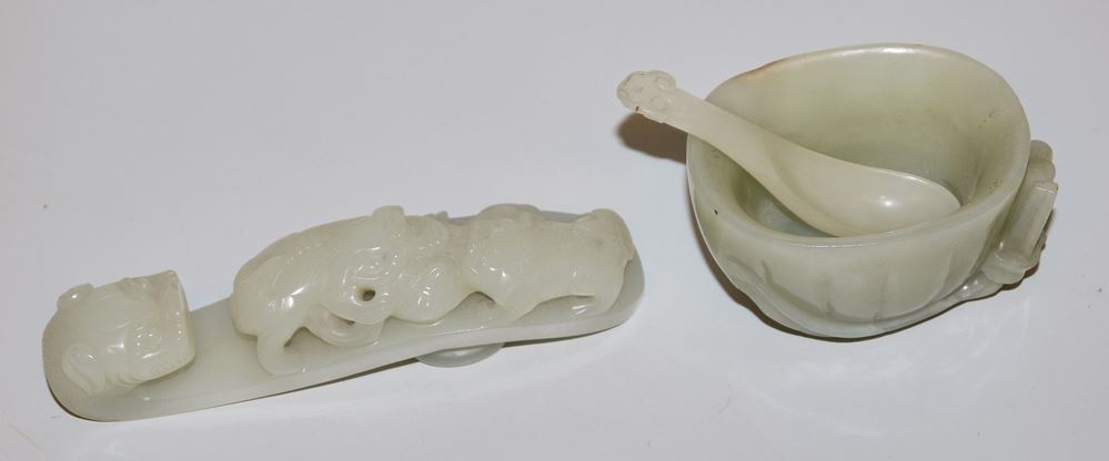Schale in Form einer Frucht (H 4,5 cm) mit zugehörigem Löffelchen (L 7 cm) sowie archaisierender Gürtelhaken mit spielenden Shishi (L 11,5 cm), alle aus fast reinweißer Nephrit-Jade