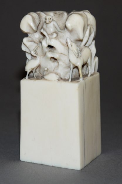 Elfenbein-Siegel der Qing-Zeit, China 18. Jh. Siegelblock mit geschnitzter Tierwelt in bergiger Landschaft, Vierzeichen-Gravur, H 7,8 cm