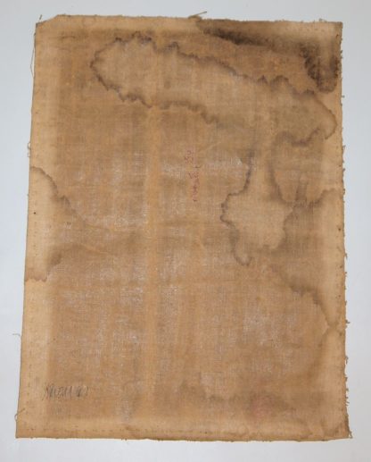 Meditationsbild eines thronenden buddhistischen Lehrers (Padmasambhava?), umgeben von vier Erscheinungen des tantrischen Pantheons, auf Drachen, Vogel, Pferd und Elefant reitend, über ihm der Reformator Tsongkhapa, feinste Stoffmalerei in Gold mit roten Akzenten auf schwarzem Grund, 38,5 x 29 cm, rückseitig Weihe-Mantra "Om Ah Hum", ohne Rahmung