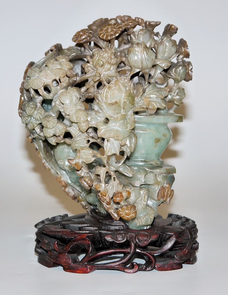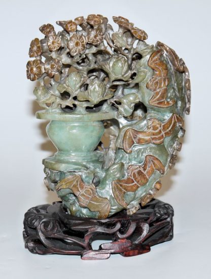 Feine Jadeschnitzerei mit Blumen und Glücksbringern, China 20. Jh. Aus einem zartgrünen Jadeblock tief geschliffenes Arrangement aus Päonien und anderen Blüten, eine Katze lugt aus der Höhlung, umseitig flattern Fledermäuse, die bräunlichen Partien des Steins gut hervorgehoben, mit zugehörigem Holzsockel, H 16 cm