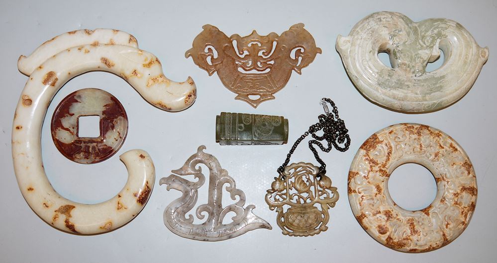 Kleine Sammlung Jade, z.T. in archaischem Stil, dabei ein C-Drachen, Bi-Scheibe, Cash-Münze und Amulette, Jade-Varietäten unterschiedlicher Farbe, Maße ca. 5 x 5 cm bis 15 x 14 cm