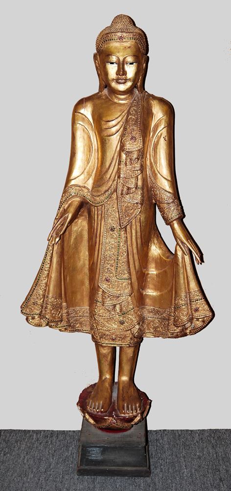 Buddha aus Holz, geschnitzt und über Rotlack vergoldet, das Gewand besetzt mit farbigen Spiegelstückchen, H 126 cm