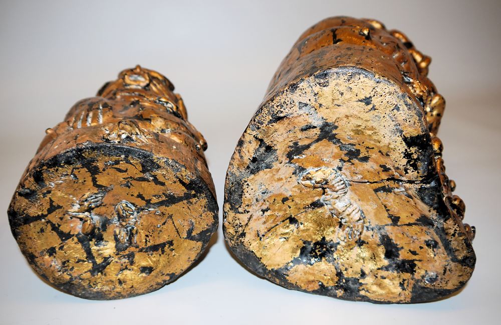 Zwei Holzskulpturen mit Lackfassung und Blattvergoldung, in Art des Buddha sitzend und mit einer Frucht bzw. Schildkröte in Händen, H 47 & 32 cm