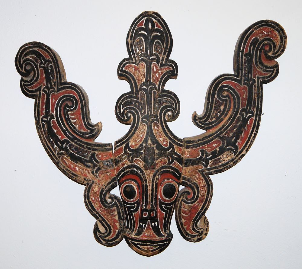 Ein "Singa" (Löwenkopf), als zentraler Schmuck und Schutz in den Giebeln der traditionellen Batak-Häuser, Architekturelement aus geschnitztem Holz mit Farbfassung und leichten Spuren der Verwitterung, selten in seiner Vollständigkeit mit den angesetzten "Flügeln", 55 x 61 cm
