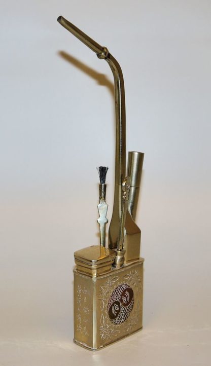 Pfeife für Tabak oder Opium, aus der silberfarbenen Legierung Paktong mit ziseliertem und vergoldetem Dekor sowie einem Sinnspruch, Pfeifenzubehör vollständig erhalten, H 27 cm