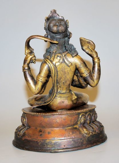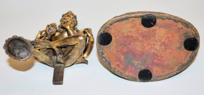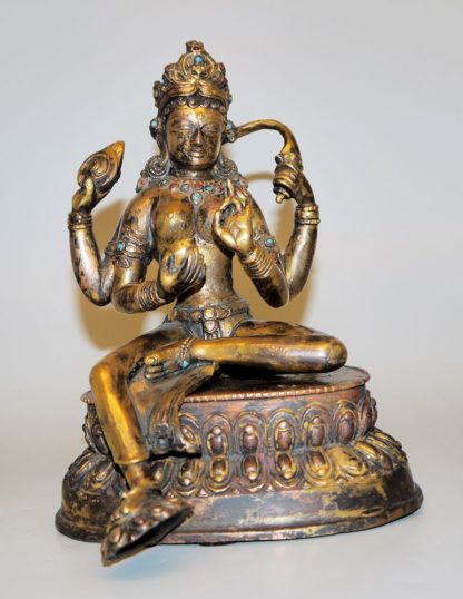 Bronzeplastik einer Göttinvon seltener Ikonographie, wohl Form der Taleju Bhavani, assoziiert mit der Göttin Durga und dem nepalesischen Kumari-Kult der "lebenden Göttin", in entspannter Haltung auf Lotusthron sitzend, in den hinteren Händen den Diskus (chakra) und das Schwert (khadga) haltend, die vorderen Hände mit Schädelschale bzw. in der Geste der Lehre, zweiteiliger Bronzeguss mit Vergoldung und Besatz aus kleinen Schmucksteinen, Bodendeckel verschlossen, H 19,5 cm