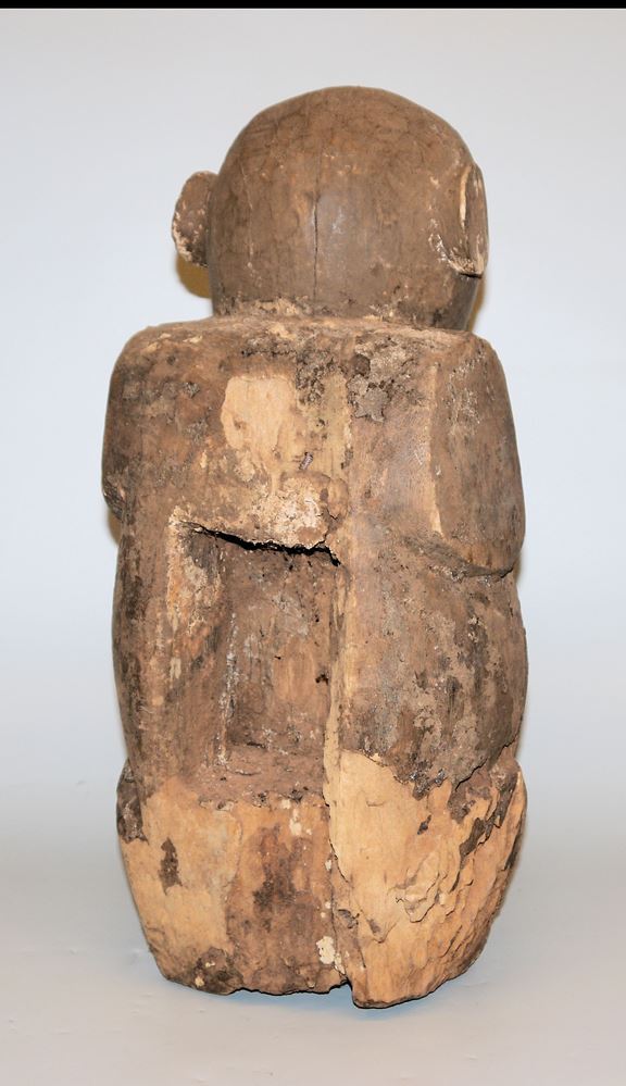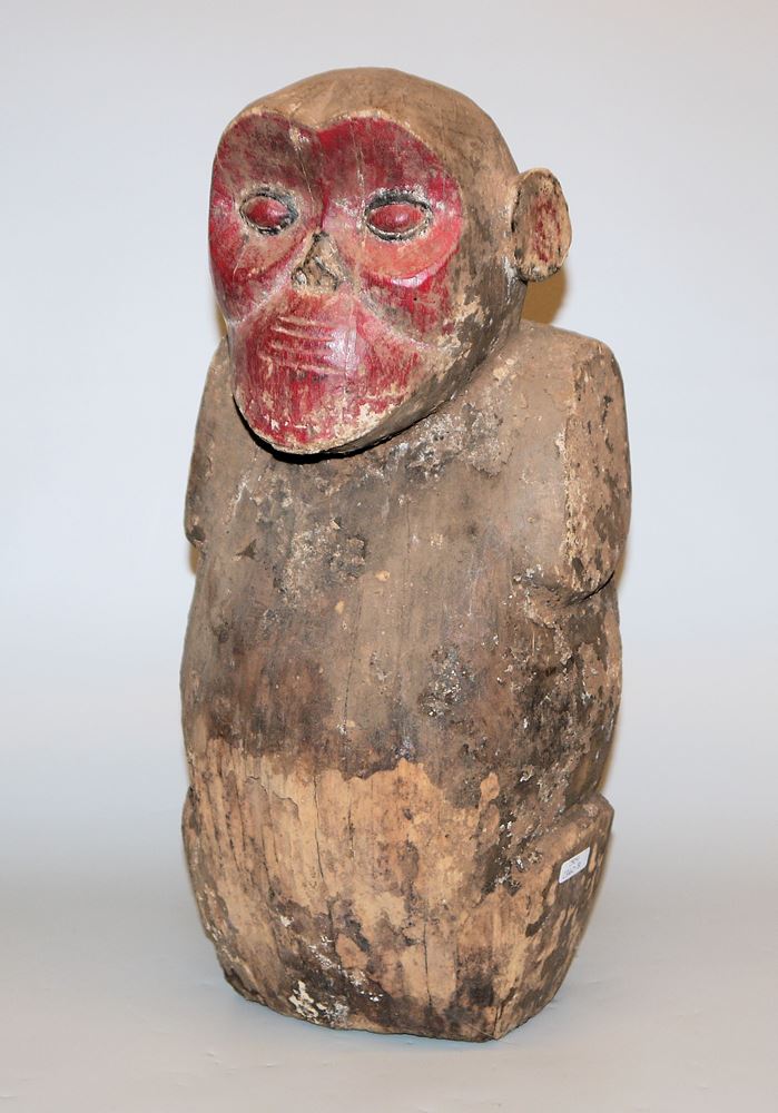 Holzskulptur eines Gorillas, der massige Körper als Torso gestaltet mit rückseitiger Höhlung, das Gesicht rot bemalt, Inkrustierungen und Insektenfraß im unteren Bereich, H 42 cm