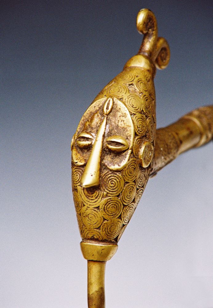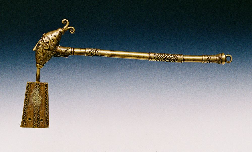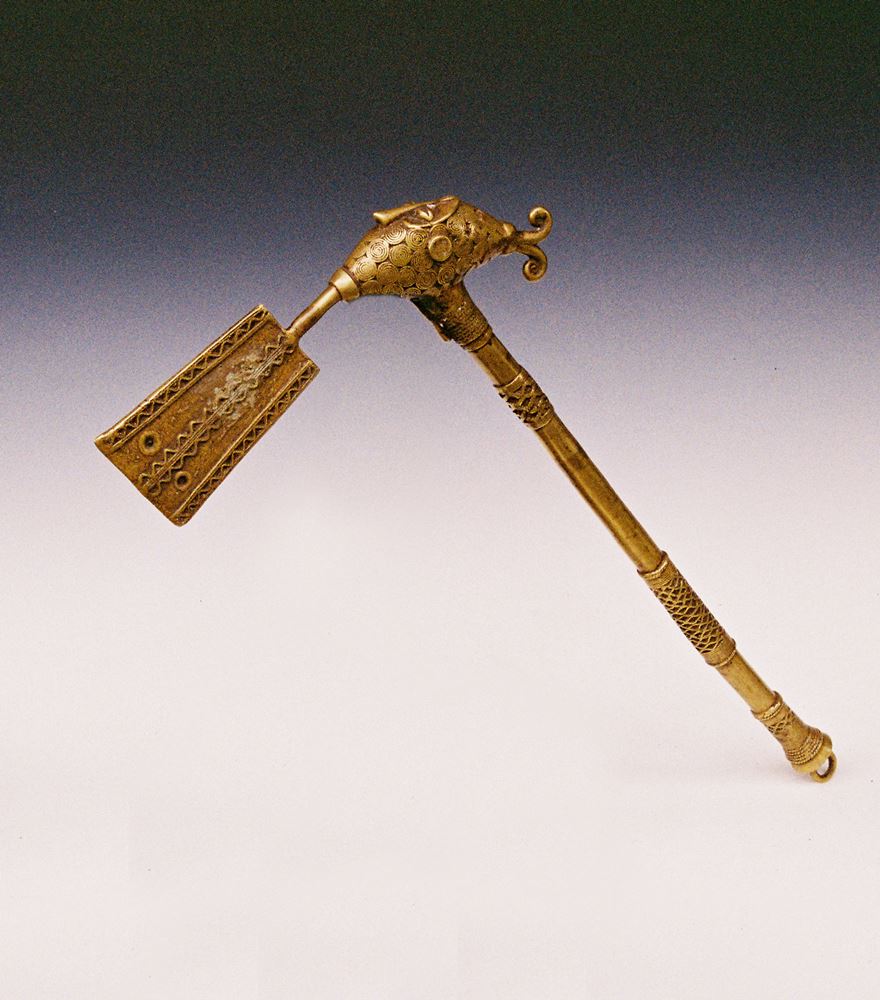 Figurative Kultaxt, Gelbguss-Bronze aus der Verlorenen Form, Würdezeichen eines Clanführers, auf dem Blatt beidseitig Spuren einer Beopferung, sehr schöner Guss, selten !, L 75 cm