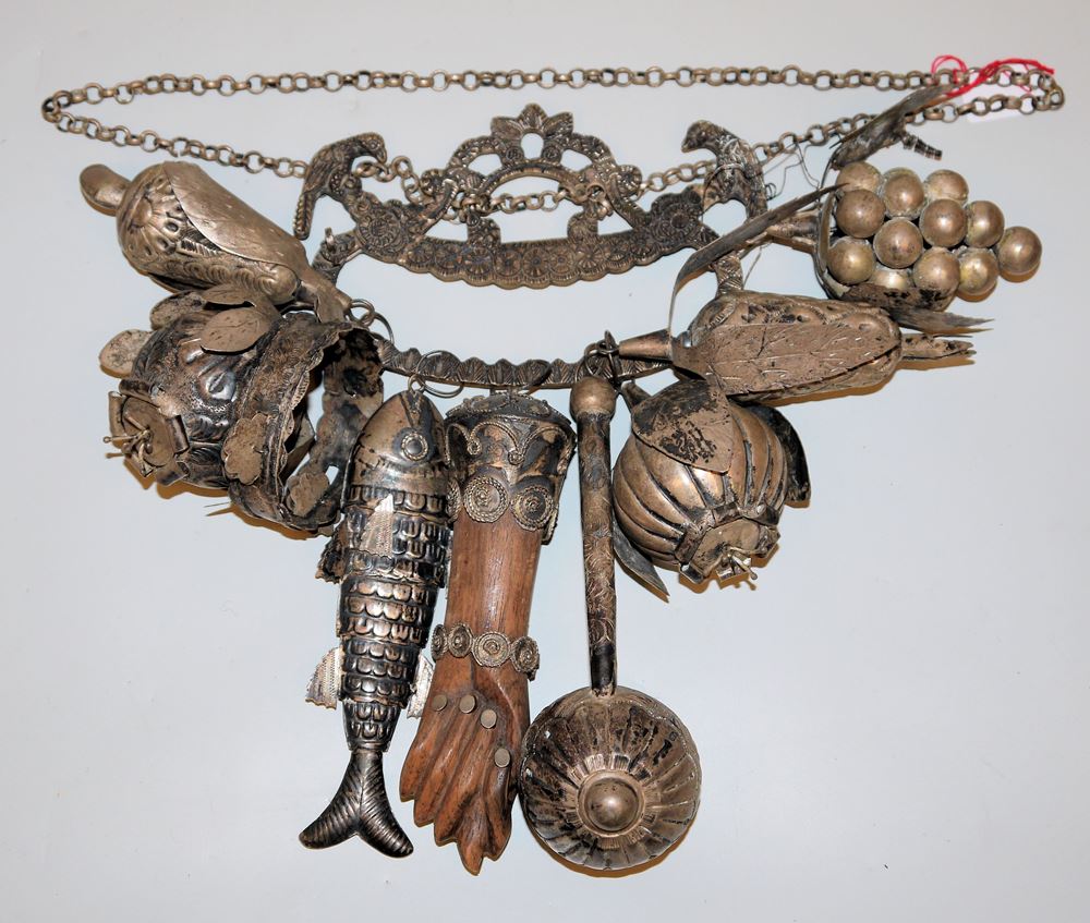Traditionelles "Sklavenamulett" mit neun Schutzanhängern, dabei der Granatapfel (Fruchtbarkeit), die Melone (Langlebigkeit), die Neidfeige (Feigenhand) gegen den bösen Blick, Fisch und andere Amulette, der Bügel aus Weißblech, die Anhänger aus Silberblech (geprüft), ca. 16 x 20 cm, an Tragekette