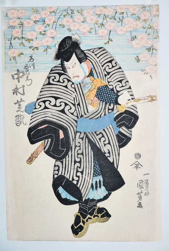 Utagawa Kuniyoshi, drei Farbholzschnitte einer Magd und zweier Samurai, Edo-Zeit, Japan, 19. Jh. Utagawa Kuniyoshi, 1797 - 1861, Blatt aus der Serie "Geschichten tugend- und heldenhafter Frauen" (kenjo reppu den), hier die Magd Take-jo (Kokuji Take-jo), die Vögel fütternd, eine Pfanne hinter ihrem Kopf bildet einen Heiligenschein, Verleger Iba-ya Sensaburo, Zensor Yoshimura (1843-46) sowie zwei Blätter mit Schauspielern als Samurai, Verleger Kawa-sho bzw. Omi-ya Heihachi, beide Zensor kiwame, alle im Oban-Format und ohne Rahmung