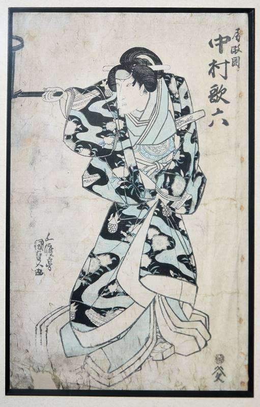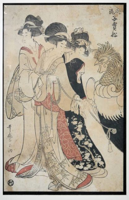 Kitagawa Utamaro (1754-1806), drei Damen ziehen ein Boot mit Phönix-Bug; Utagawa Kunisada I (1786-1864), Kurtisane spielt die Kokyu und Schauspieler in weiblicher Rolle sowie Toyokuni I (1769-1825), Kurtisanen mit ihren Maiko, alle Blätter im Oban-Format, ca. 36/37 x 25 cm unter Passepartout und Rahmung sichtbar, altersbedingt geblichen, Papierschäden stellenweise hinterlegt