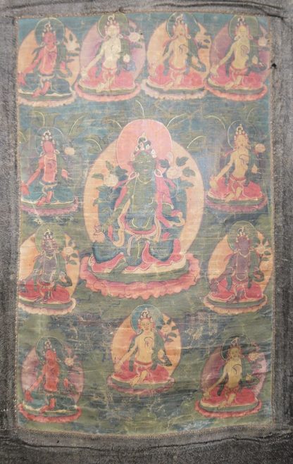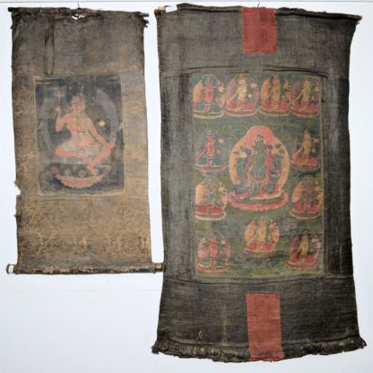 Meditationsbild der weiblichen Bodhisattvi, Verkörperung des Mitgefühls Buddhas, die Hauptfigur umgeben von zehn weiteren Aspekten unterschiedlicher Farbe, Malerei auf Stoff, 46 x 31 cm (ges. 80 x 50 cm) sowie ein weiteres Thangka einer Gottheit mit Schädelstab (Khatvanga), wohl einer tantrischen Yogini, 28 x 20,5 cm (ges. 61 x 31 cm), beide Thangka altersbedingt stark rußgeschwärzt, die Stoffe rissig