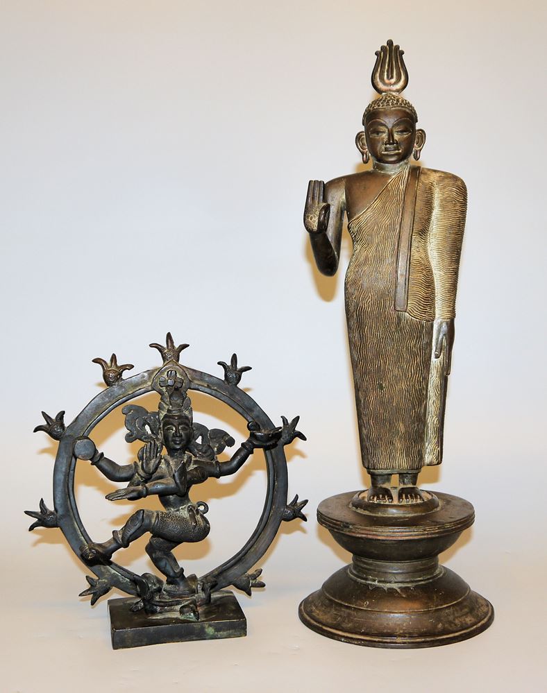 Stehender Buddha aus Sri Lanka und ein tanzender Shiva, zwei Bronzeplastiken, Mitte 20. Jh.