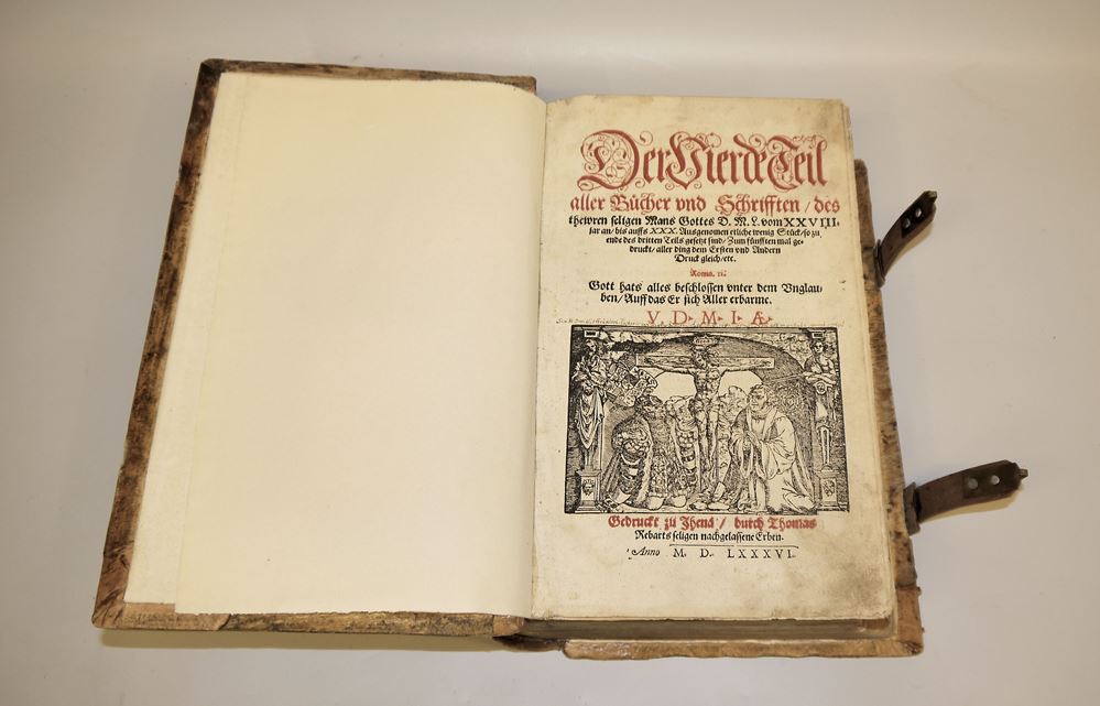 Lutherbibel von 1586 Martin Luther, Der Vierde Teil aller Bücher und Schrifften / des thewren seligen Mans Gottes D. M. L. vom XXVIII. jar an / bis auffs XXX. ... Zum fünften mal gedruckt / aller ding dem Ersten und Andern Druck gleich / etc. Jena, Thomas Rebarts Erben, 1586, Folio,Titel in Rot und Schwarz mit Titelholzschnitt, 1 Holzschnitt im Text, Karte auf Bl. 473 r. und 2 wiederholte Textholzschnitte, 547 nummerierte Blätter, im geprägten Schweinslederband der Zeit über Holzdeckeln, mit zwei Schließen