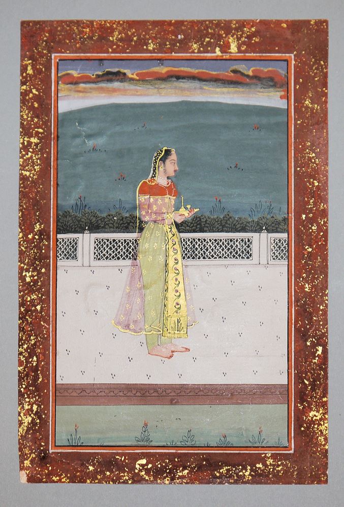 Eine einsame vornehme Dame mit Schmuck und transparentem Sari trägt eine goldenes Weintablett, Symbolik für die Sehnsucht nach dem abwesenden Geliebten, Feinmalerei auf Karton, 19,5 x 11,7 cm, sekundär neu gefasst in ein Passepartout mit Goldflecken, Ges.-Maß 23,2 x 15,5 cm, ohne Rahmung