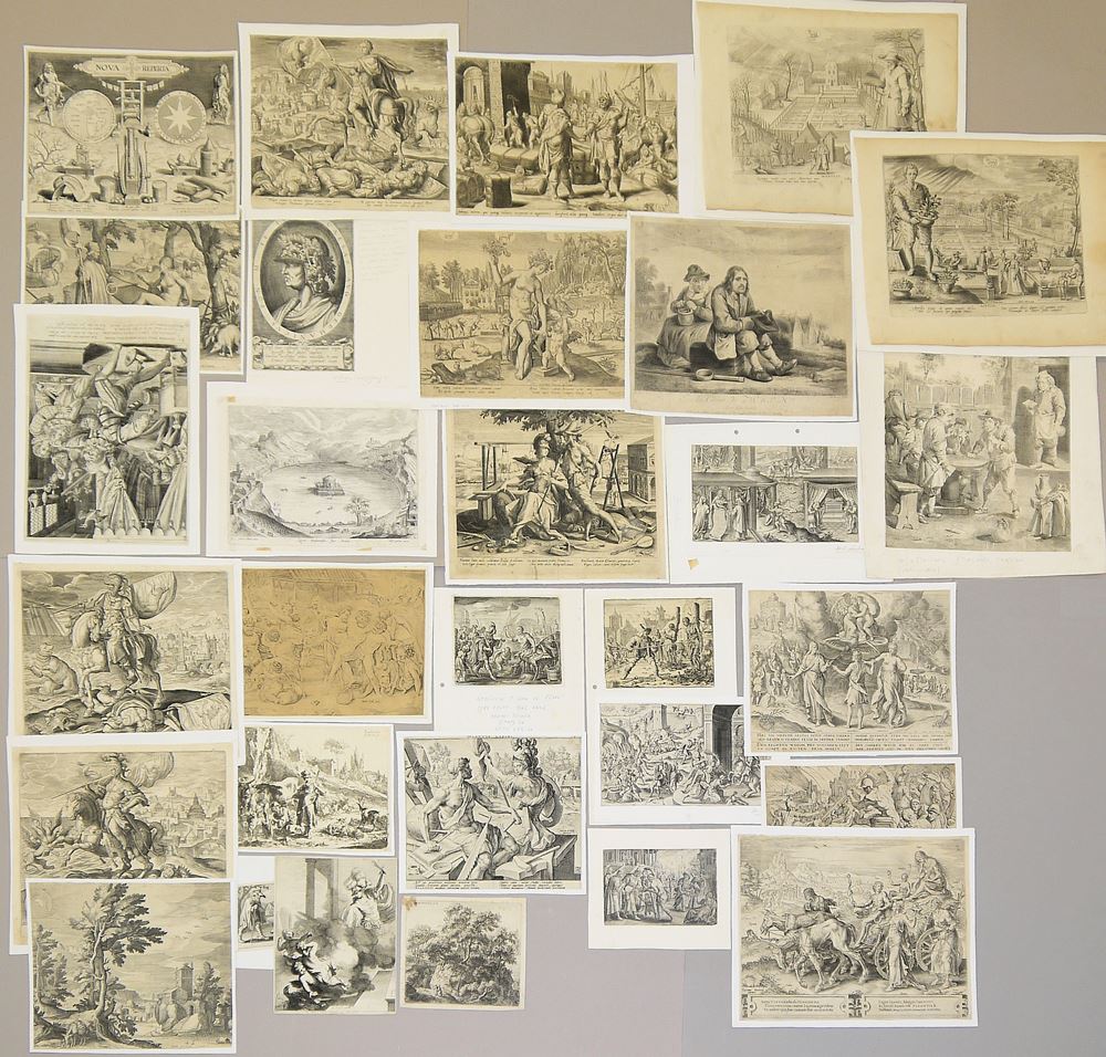 Sammlungs-Nachlass mit 30 Blatt Altmeister-Graphik des niederländisch/flämischen "Goldenen Zeitalters", alles Originale des 16. / 17. Jhs. Originale Kupferstiche und Radierungen des 16./17. Jhs. von und nach: Marten de Vos (1532 - Antwerpen - 1603) / Jan van Luyck (um 1580 Amsterdam) / David II Teniers (1610 Antwerpen - 1690 Brüssel) / Nicolas Vischer (1618 - Amsterdam - 1679) / Adriaen P.van der Venne (1585 Delft - 1662 Haag) / Michel van Lochom (1601 Antwerpen - 1647 Paris ) / Jan Luyken (1649 - Amsterdam - 1712 ) / Jansz Harmen Muller (1540 - Amsterdam - 1617) / Matth. Bril (um 1540 Antwerpen) / Assuerus van Londerseel (1572/3 - Antwerpen - 1635) - Jan de Vischer/ Nicolas Berchem (1636 - Amsterdam - 1692) / auch zwei Italiener dabei: Matteo Florini (1580 - Siena - 1603) & Antonio Salamanca /(1500 Mailand - 1562 Rom) mit Trunkener Bacchus & Gefolge / Jan Stradanus (1523 Brügge - 1605 Florenz) mit dem seltenen Blatt "America" / Jodocus II Momper (1564- Antwerpen -1635) / auch ein Deutscher dabei: Wolfgang Kilian (1581- Augsburg - 1662) / Joan Galle (1600- Antwerpen - 1676) / Hendrick II van Cleve (flämisch um 1525 - 1589) / Anthonie Waterloo (1610 - 1690) / Theodor van Thulden (1606 -Herzogenbusch - 1669) / Maarten van Heemskerk (1498 Heemskerk - 1574 Haarlem) / Thomas de Lev (1556 Flandern - 1614 Paris), alle Blätter in guter Erhaltung