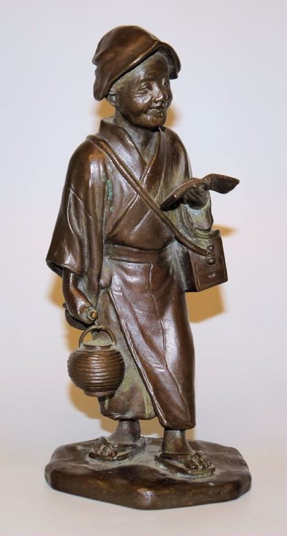 Fröhlicher Mann mit Tragekasten und Lampion, aus einem aufgeschlagenen Buch rezitierend, Bronze mit dunkler Patina, auf dem Sockel signiert, H 18,5 cm