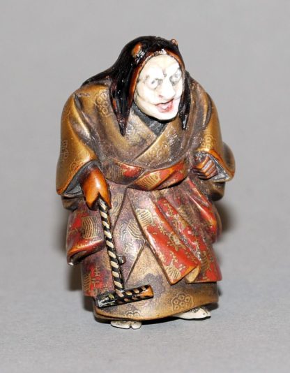 Der No-Schauspieler in der Rolle der Hexe, mit einem Stock leicht gebeugt stehend, Holz mit Lackfassung und Vergoldung, Gesicht und Füße aus Elfenbein, mit CITES von 2025, H 4,7 cm (Prov.: ehemals Sammlung des Künstlers Hanns Jatzlau, 1926-2010)