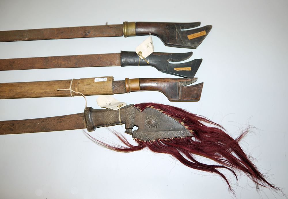 Ein "Surik" der Meos-Ethnie in Zentral-Timor, Langwaffe mit leicht gebogener Rückenklinge aus älterer europäischer Herstellung, punziert 1778, der Holzgriff fein beschnitzt mit Flechtbändern und einer Rosette sowie angestecktem Pferdehaar, L 73 cm sowie drei "Alamang" der Bugis-Ethnie auf Sulawesi, gerade Rückenklingen und formtypische Hartholzgriffe, einmal mit Scheide, L 66,5 bis 74,5 cm, die Klingen altersbedingt flugrostig, alle Waffen mit alten Registrierungszetteln bzw. Etikettierungen
