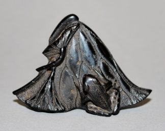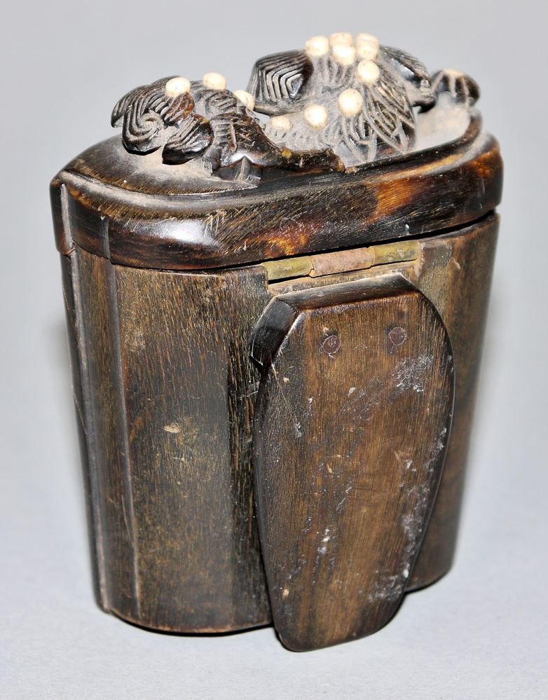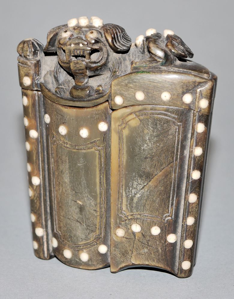 Eine Gürteldose aus dunklem Tierhorn mit hellen punktuellen Intarsien, gestaltet in Art einer Schriftrolle, der aufklappbare Deckel mit aufsitzendem Shishi oder Fu-Hund, rückseitig ein Gürtelclip, 7,5 x 6,2 x 3,5 cm