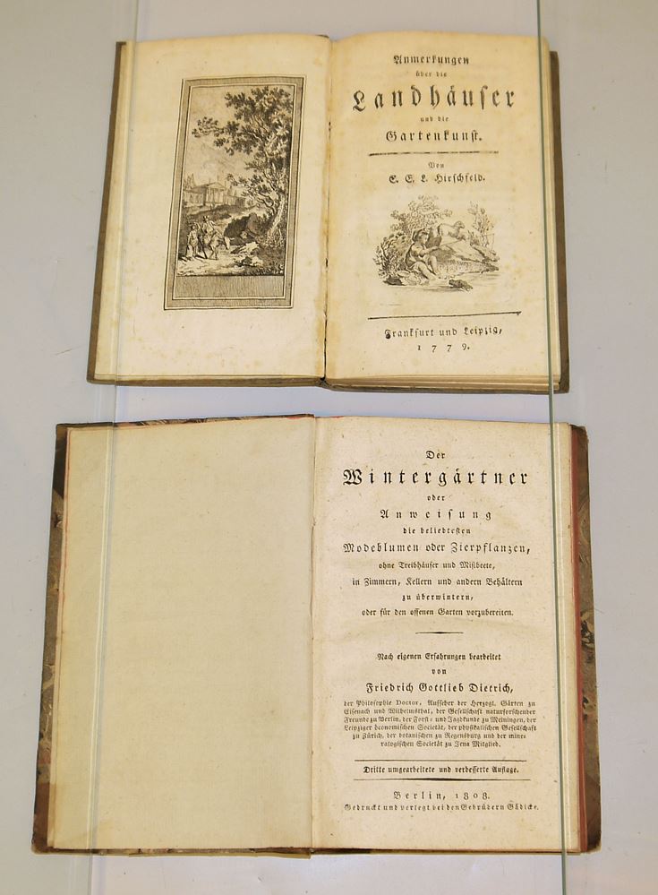 2 x Antiquarisches zum Gartenbau von 1779 und 1808 Hirschfeld, C. C. L. (Christian Cay Lorenz), Anmerkungen über die Landhäuser und die Gartenkunst, mit gestochenem Frontispiz sowie mit 1 Titelvignette, 127 S., Frankfurt und Leipzig, 1779, im Pappeiband; Der Wintergärtner oder Anweisung die beliebtesten Modeblumen oder Zierpflanzen (...) zu überwintern, von Friedrich Gottlieb Dietrich, Gebr. Gädicke, Berlin 1808, 3. Aufl., 248 S., im Halbleder