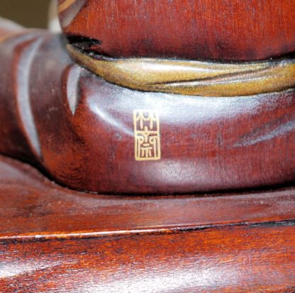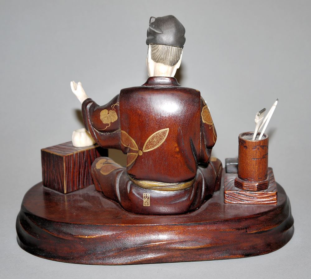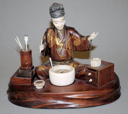 Der sitzende Mann mit Tuschepinsel in der Rechten, vor ihm ein Hibachi, neben ihm ein Pinselbecher, die Tuschreibeschale und die Pinselwaschschale, links ein Tansu, das Gewand in Maki-e und Aogai dekoriert, das Malobjekt fehlt (wohl ein Handfächer), rückseitig signiert Chikusai, mit CITES von 2025, H 17,5 cm