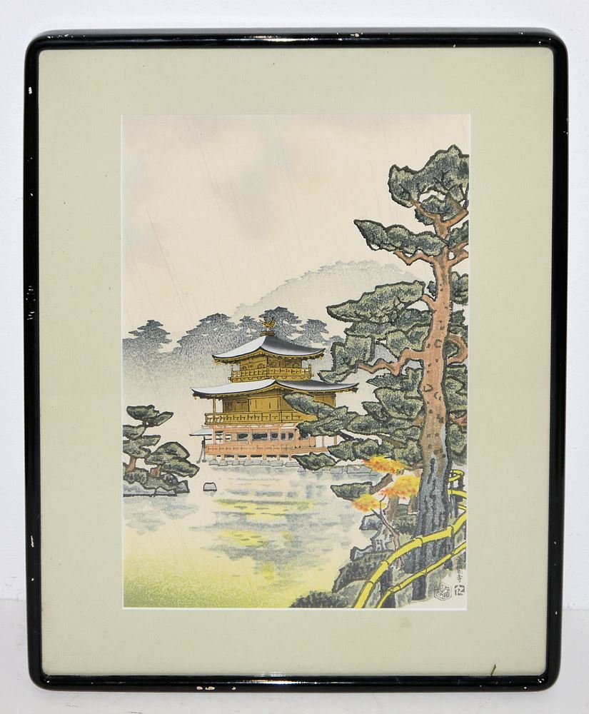 Nisaburo Ito, Goldener Pavillon, Farbholzschnitt, Japan um 1950 Nisaburo Ito, 1910-1988, japanischer Maler und Holzschneider, herbstlicher Blick auf den berühmten Goldenen Pavillon Kyotos in leichtem Regen, das Bauwerk wie das Original in Gold metallisch leuchtend, Oban-Format, 39 x 26 cm, unter Passepartout und Glas gerahmt