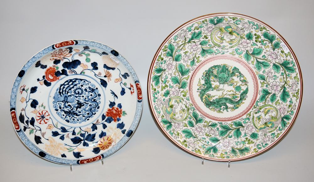 Großer Imari-Teller, im Spiegel das Drachen/Phönix-Motiv, umrahmt von blühenden Ranken, ein kleiner Randschaden geklebt, auf dem Boden apokryphe chinesische Ming-Marke (Dm 31,5 cm) sowie ein Kutani-Teller mit gleichen Motiven in anderer Gestaltung, auf Boden grüne Manufaktur-Siegelmarke (Dm 37 cm)