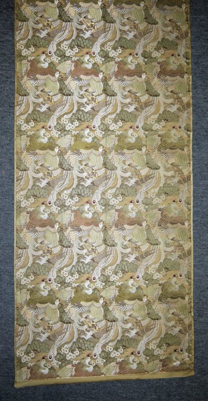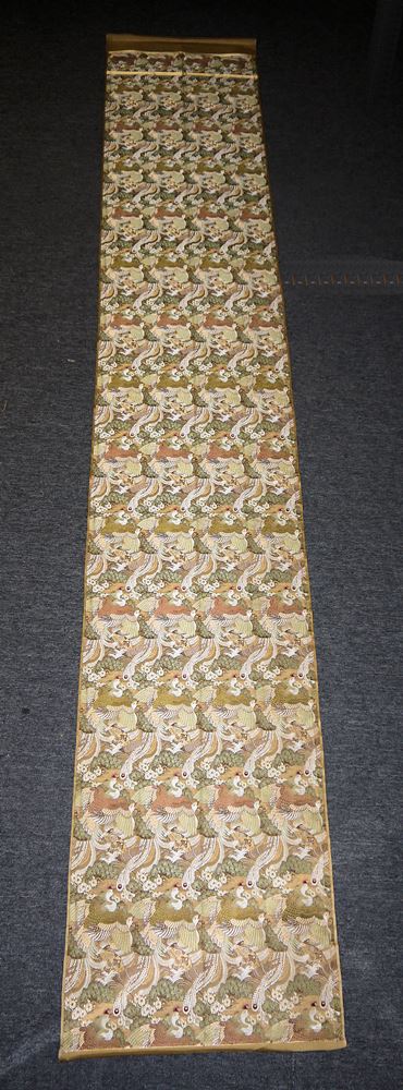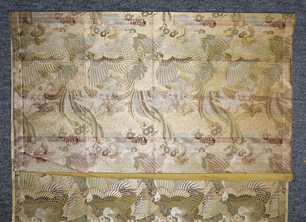 Noch unvernähter Obi mit kopulierenden Pfauenpaaren und der Laute Biwa im Rapport (417 x 69 cm) sowie ein vernähter Obi mit Phönixpaaren und blühendem Rankenwerk (389 x 33 cm), beide in exzellenter Erhaltung