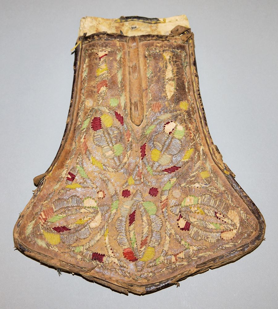 Ein osmanisches Pistolenholster, Türkei/Balkan 18./19.Jh. Holster für zwei Steinschlosspistolen, Leder mit Fadenstickerei, altersbedingt starke Gebrauchsspuren, 28 x 24 cm
