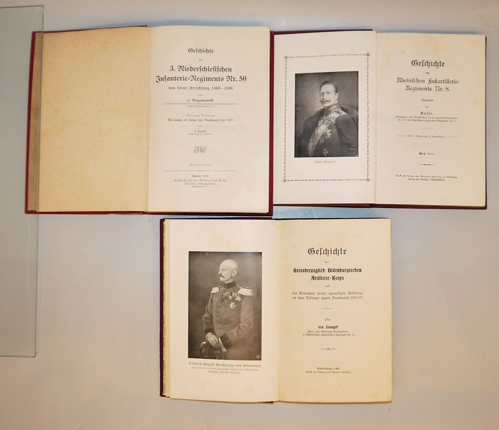Drei Bücher zur Militärgeschichte der deutschen Kaiserzeit Geschichte des 3. Niederschlesischen Infanterie-Regiments Nr. 50 von Albert von Boguslawski, Berlin 1910; Geschichte des Rheinischen Fußartillerie-Regiments Nr. 8 von Busse, Metz 1910 und Geschichte des Großherzoglich Oldenburgischen Artillerie-Korps von Von Stumpf, alle in Leineneinband mit Goldprägung und in gutem Zustand