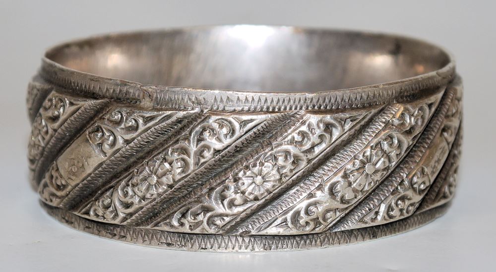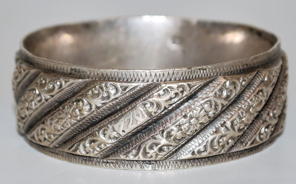 Armreif aus hochwertigem Silber mit feiner floraler Gravur, drei Markierungen für wohl jüdischen Silberschmied und Datierung (1)229 = 1808/09 AD, innenseitig eine weitere undeutliche Marke für Silbergehalt, Innen-Dm 7,2 cm, Gew. 185 gr