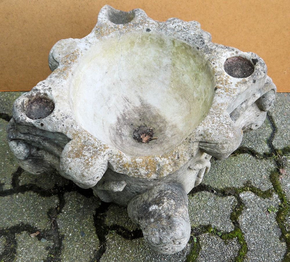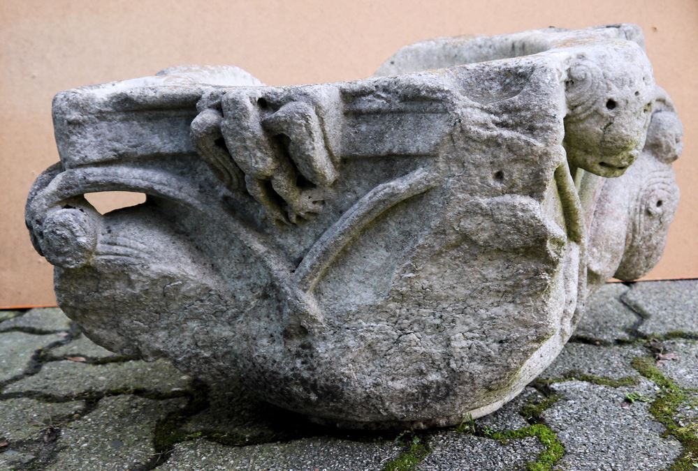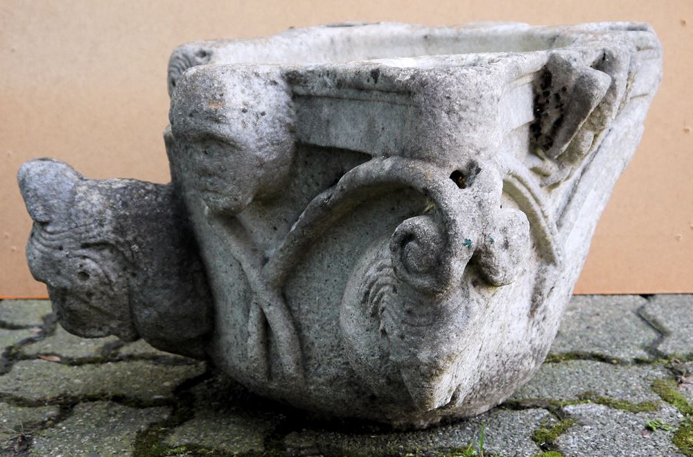 Weihwasserbecker, romanisch-frühgotisch, 12./13. Jh. Kalkstein, rundes Becken, auf Wandung vier Löwenprotomen, unter Kreuzvoluten, einmal weggebrochen, an der Umfassung des Randes 2 Menschenköpfe, einmal Löwenkopf und einmal Adler im Relief, auf der Umrandung vier kleine runde Vertiefungen, 32 x 59 x 57 cm