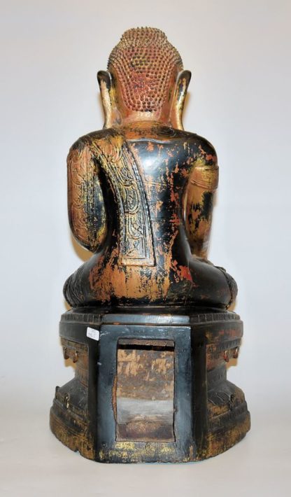 Auf profiliertem Thron sitzender Buddha in der Geste der Erdberührung, geschnitztes Holz mit Lackfassung und Resten der Vergoldung, offenes Weihefach auf der Sockelrückseite, H 46 cm