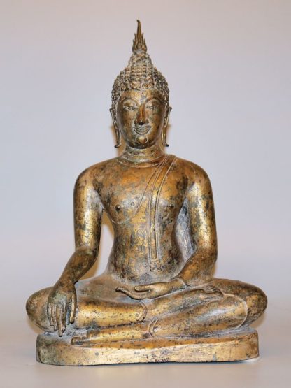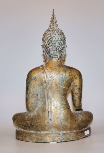 Buddha aus Bronze, wohl Ayutthaya-Periode, Thailand ca. 17. Jh. Sitzender Buddha in der Geste der Erdberührung, Bronzeguss mit etwas verwitterter Blattvergoldung, H 33,5 cm