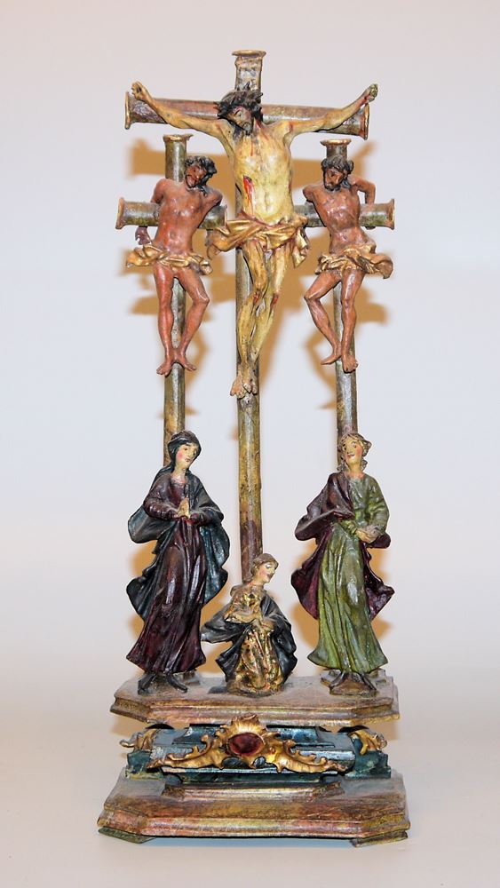 Kreuzigungsgruppe, alpenländisch um 1760 Christus im Dreinageltypus am Kreuz, neben ihm die beiden "Schächer" an kleineren Kreuzen, davor die Hlg. Maria, Maria Magdalena und Johannes, auf mehrfach gegliedertem Podest mit Rocaillenschild, Holz geschnitzt und farbig gefasst, H 37 cm x B 14 cm x T 8 cm, in sekundären Plexiglas- Schutzgehäuse, in sehr guter Erhaltung