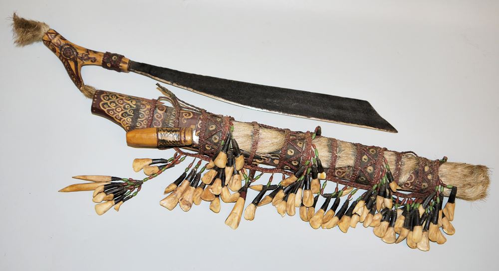 Schwert der ehemaligen Kopfjäger Borneos, typisch geformte Rückenklinge, gegabelter Griff aus Hirschhorn mit Haarbesatz, die Holzscheide mit Rotangbändern, Tierzähnen und Glasperlen geschmückt, angeschnürt ein Beimesser mit Holzschaft und Horngriff, Ges.-L 68 cm