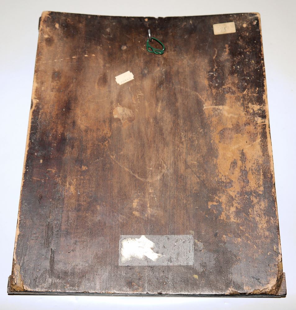 Hl. Georg, im Prunkharnisch zu Pferd mit der Lanze den Drachen tötend, im Hintergrund Architektur mit Hofstaat, oben Christus im Himmelsegment und ein heranfliegender Engel mit Krone, Eitempera/Holz, 38,8 x 32,2 cm, partiell Blattvergoldung, Petersburg oder Moskau mit Jaroslaver Stilelementen, beil. Expertise von 2001