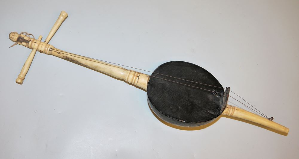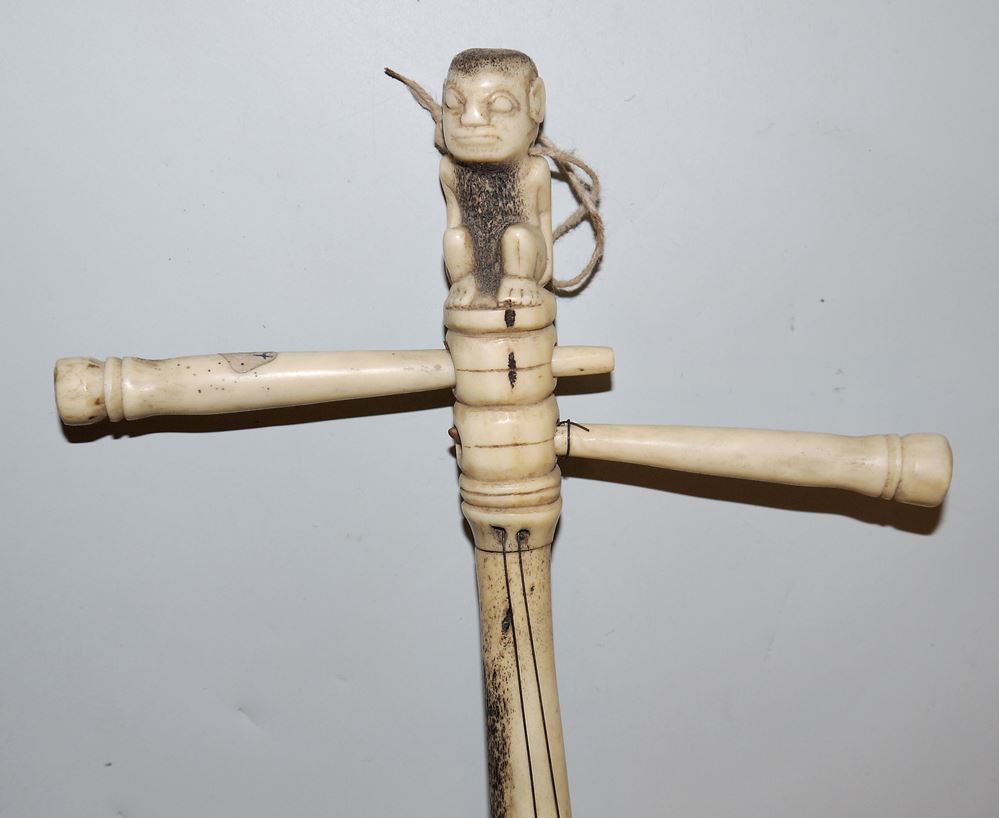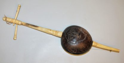 Außergewöhnliche Version des ursprünglich aus dem Orient eingeführten Streichinstruments, der Hals aus Geweih oder Knochen gedrechselt, der Kopf geschnitzt zu einer hockenden Ahnenfigur, der Klangkörper aus einer Kokosnussschale mit apotropäischem Gesicht, Bespannung mit zwei Metallsaiten, spielfähig, wohl Sumatra oder Kalimantan, L 52 cm