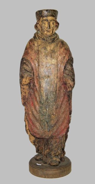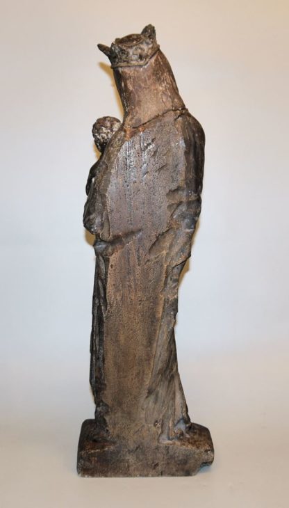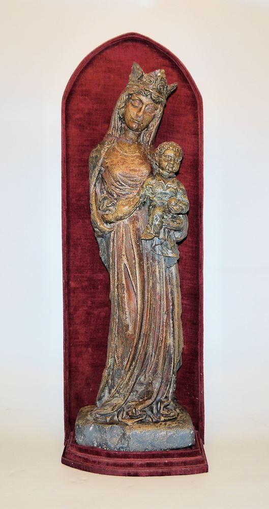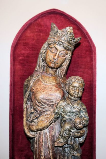 In eleganter Schwingung steht die bekrönte Madonna in faltenreichem Ober- und Untergewand auf einem Sockel. Das Untergewand hat Reste der roten Farbe, das Übergewand Reste der blauen Farbe erhalten. Das Haupt Mariens wird von gewelltem Haar gerahmt und trägt eine verzierte Krone. Das Kind auf dem rechten Arm der Madonna ergreift ihre linke Hand. In der rechten Hand hält das Kind einen Vogel oder ein Beißsäckchen. Sein Gesicht ist von kurzen, lockigen Haaren umgeben. Die Rückseite der Figur ist blockroh abgeplattet. Kalksandstein mit Resten der originalen Bemalung. Der Kopf des Kindes und der Madonna war abgebrochen und wurde sekundär neu fixiert. Der linke Fuß des Kindes ist bestoßen bestoßen, an der linken hinteren Ecke des Sockels ein kaum störender Abschlag, H 58 cm, mit passgenauem, älteren, für die Figur speziell angefertigtem Samt-Nischensockel in Rot