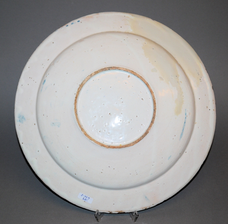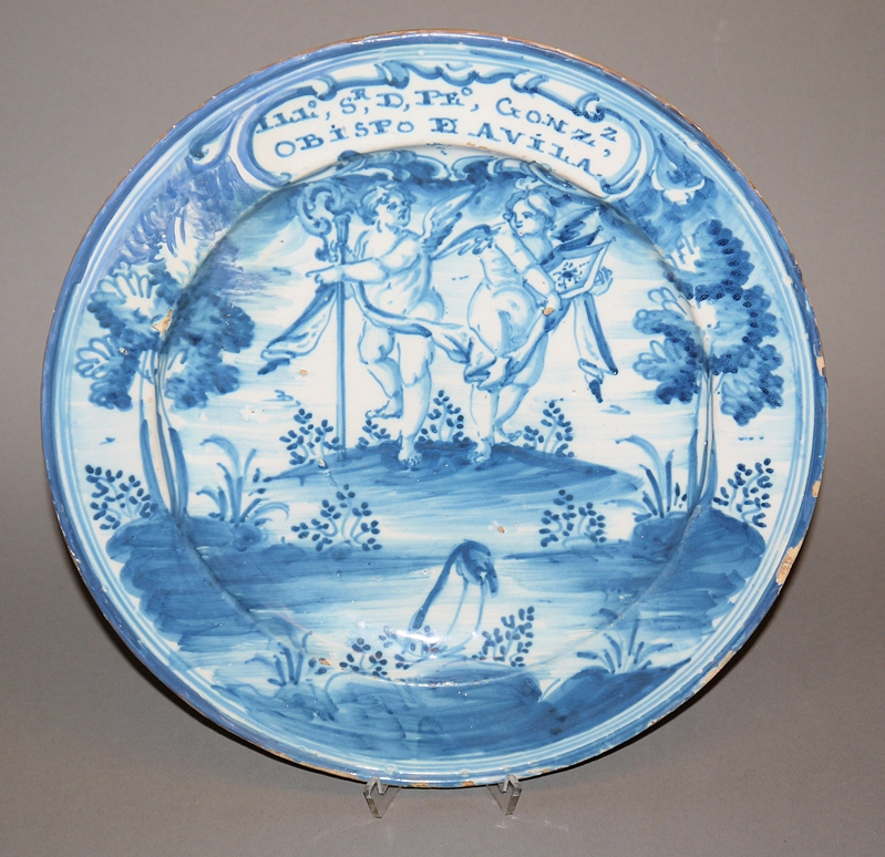 Großer Teller mit von Bäumen gesäumter Landschaft, in der zwei Engel den Bischofsstab und die Bischofsmütze tragen, Blaumalerei, oben Kartusche mit der Beischrift: "ILLo, Sr, D, PEo, GONZz OBISPO D AVILA”, Dm 34,5 cm, am Rand Glasurchips, kl. Aufplatzungen vom Brand, Teilstück an der linken Seite des Tellers fachmännisch restauriert. Don Pedro Gonzalez Garcia war 1743-1758 Bischof von Avila, geb. in Tordelaguna 1683, studierte er am Kolleg von Santa María de Teologos der Universität Alcalá, wurde dann erster Sekretär der Königlich Spanischen Akademie. Aus einer "königlichen Urkunde" geht hervor, dass er von Felipe V. von Spanien am 15. Februar 1743 zum Bistum Ávila in Kastilien befördert wurde. Er starb 1758 in seinem Bischofspalast.