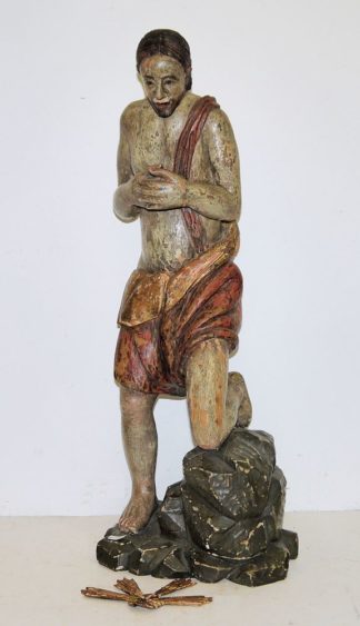 Bischof, wohl der Hl. Servatius, Holzskulptur um 1620 Skulptur eines Bischofs mit Tiara und edlem, schönfaltigem Gewand, unter dessen Saum die Spitzen zweier Schuhe hervorschauen. Die Hände sind eingesteckt, die linke Hand wohl sekundär, der ursprüngliche Bischofsstab in seiner Rechten ist nicht mehr vorhanden. Dargestellt ist wohl Servatius von Tongern (*vermutlich Armenien- 384 Maastricht), kurz Servatius, einer der Eisheiligen, der insbesondere am 13. Mai verehrt wird. Der hl. Servatius wird zumeist im Bischofsornat mit Hirtenstab dargestellt. Eiche, vollplastisch geschnitzt, H 64 cm, die Oberfläche fachmännisch überarbeitet.