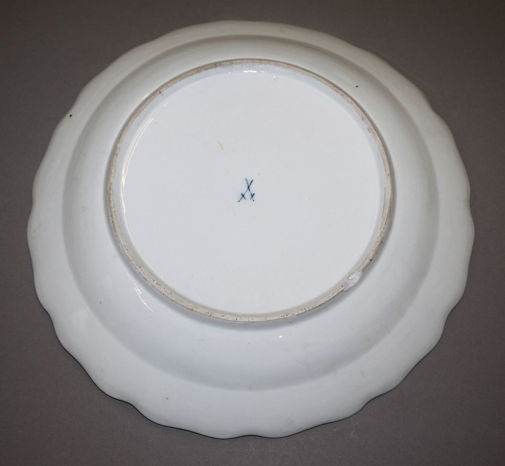 Großer Pfauenteller, Kgl. Meißen um 1745 Seltener Porzellanteller mit gewelltem Rand, polychrom bemalt mit einem Pfauenpaar aus Bäumen, im Fond in Purpur eine Hafenbastion, ein Chip am Stand, ansonsten einwandfrei, Dm 34 cm (Vergl.: Bonhams, The Hoffmeister Collection, 25. November 2009, Lot 48)